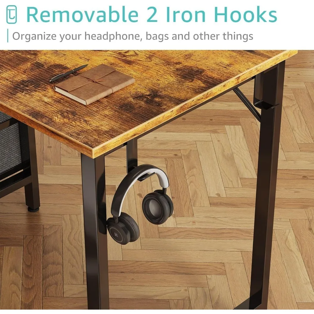 Computer Desk: This compact desk measures 47.2 inches in length, 19.7 inches in width, and 29.5 inches in height, making it ideal for saving space in a bedroom, school, or office. Suitable for students, teenagers, and adults, this desk is approved by the USPTO and is designed for writing and working. Vintage Style Design: Featuring 4 fabric drawers, this desk offers two installation options (left or right). Crafted from durable P2 particle wood board, it is scratch-resistant, anti-collision, and waterproof. The rustic brown desktop and black metal steel frame complement most room decorations, making it a charming choice for small spaces. Sturdy Structure: Enhanced stability is provided by additional fixed steel brackets and adjustable leg pads, ensuring the desk remains level. Non-slip and anti-scratch protectors under the legs protect your floor from scratches and reduce noise when moving, making it suitable for a teenager's or writer's workstation. Easy Assembly: A comprehensive instruction manual and tool are included, requiring no additional tools. Assembly is quick and easy, taking approximately 20 minutes.