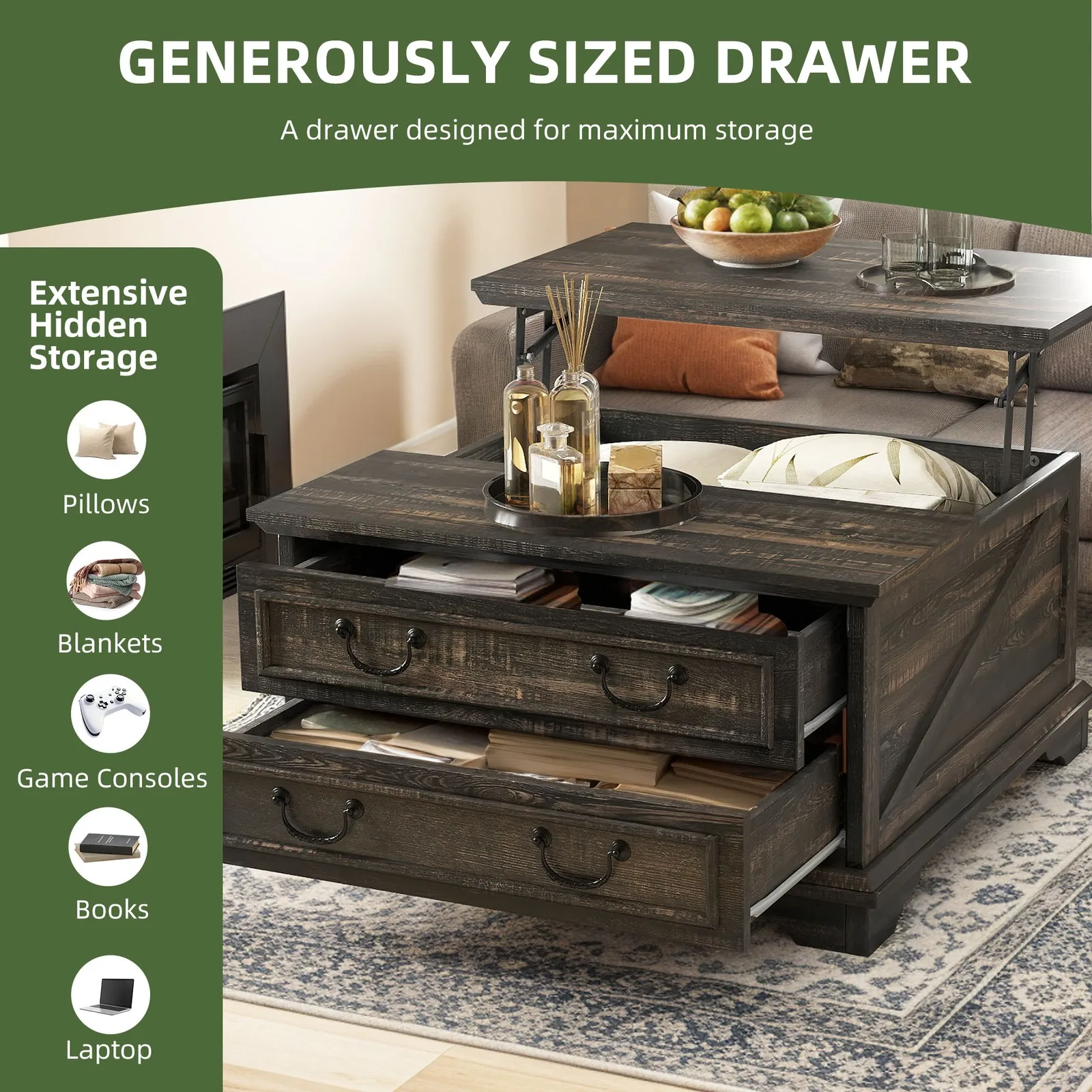 Ergonomic design: The use of high-end lifting mechanism and gas support system, can provide smooth and non-oscillating lifting function, bearing up to 33 pounds. The height of the desktop can be adjusted from 18 inches to 24 inches, which is perfect for laptop use, dining, gaming or leisure time on the sofa.Large storage space: the overall size is 31.5" w x 31.5" d x 18" h, and there is also a hidden compartment inside (28" w x 16.7" d x 13" h), which can store pillows, blankets, magazines, laptops, etc. 2 sliding drawers can also be used to store a variety of daily items, very practical.
