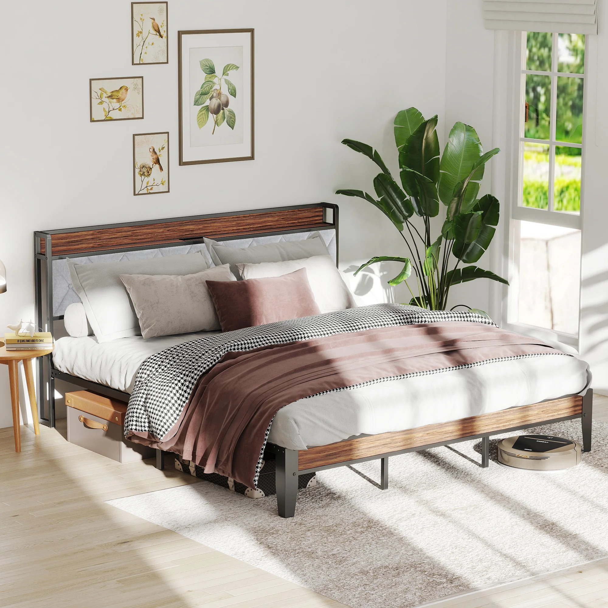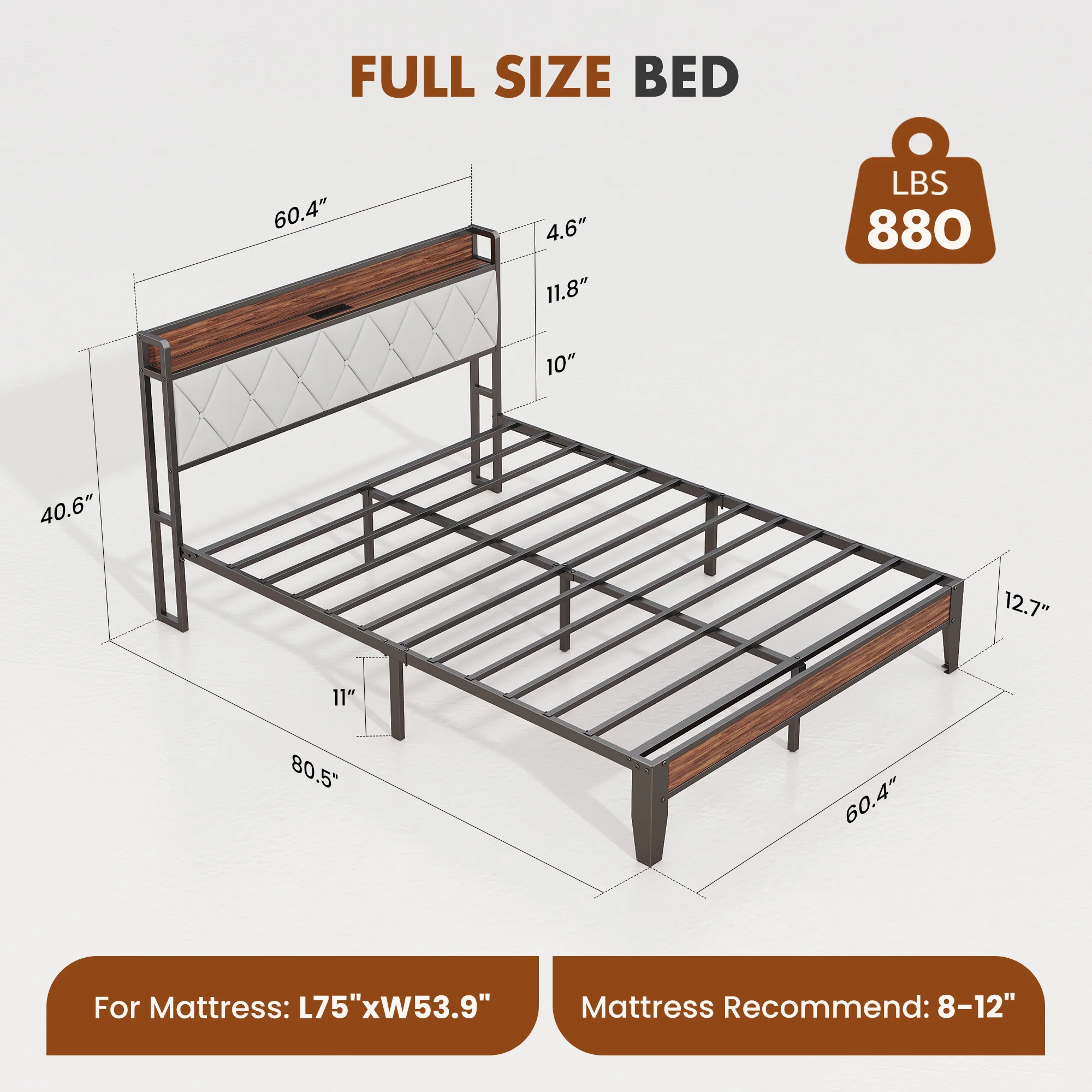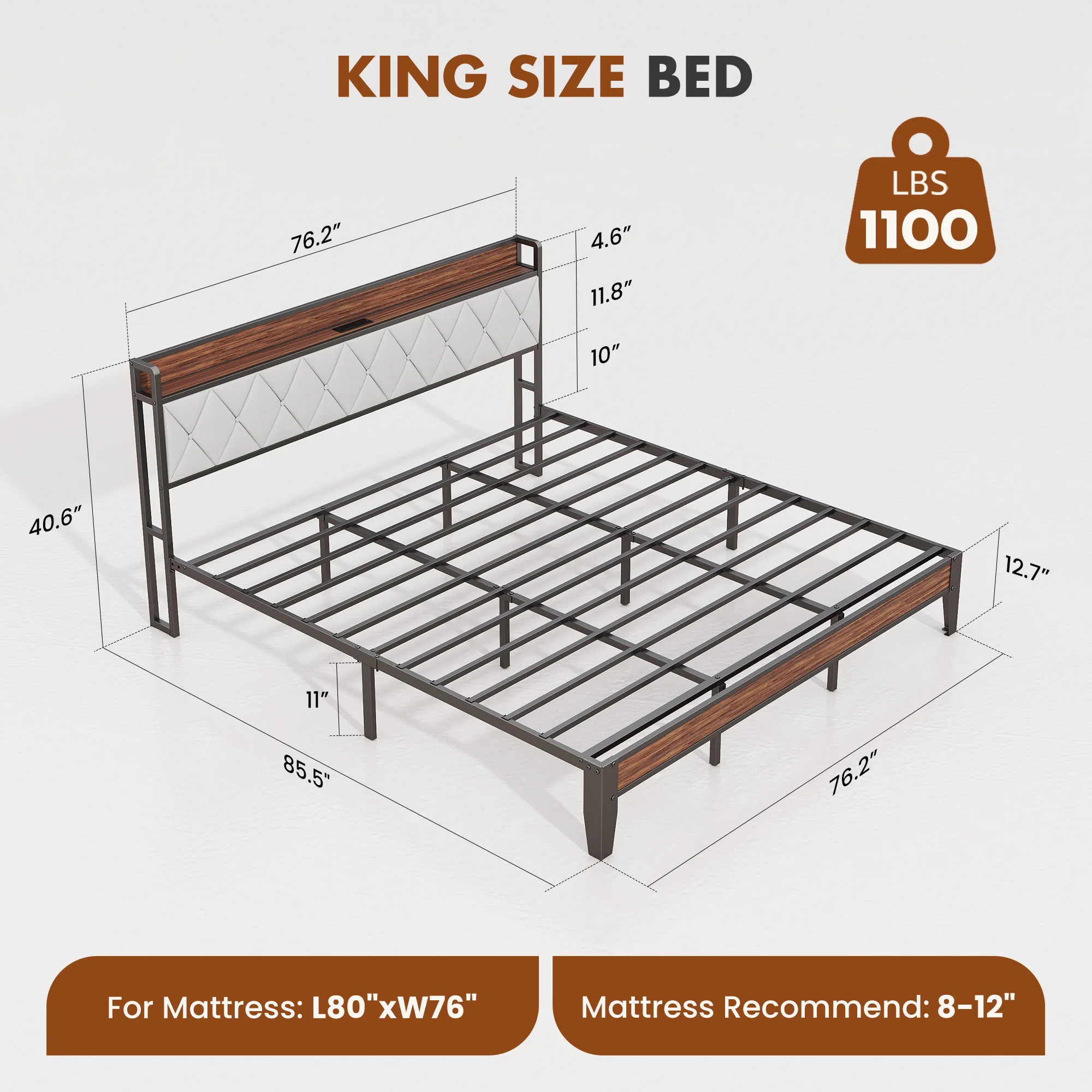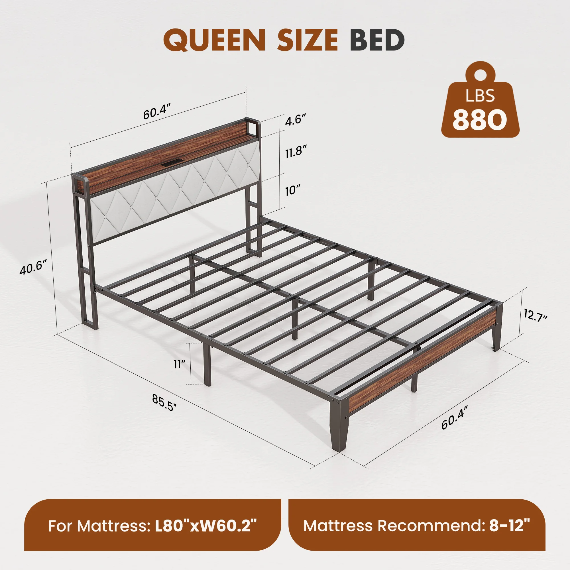 【Smart Storage & Charging Station】:This bed frame with storage offers 11"of under-bed clearance,perfect for storing extra bedding, luggage,or seasonal items.The headboard features a 5.5"wide shelf for your essentials and built-in charging with 2 power outlets (125V,12A) and 2 USB ports (5V,2.1A) - keeping your devices powered and within reach while you sleep or relax.