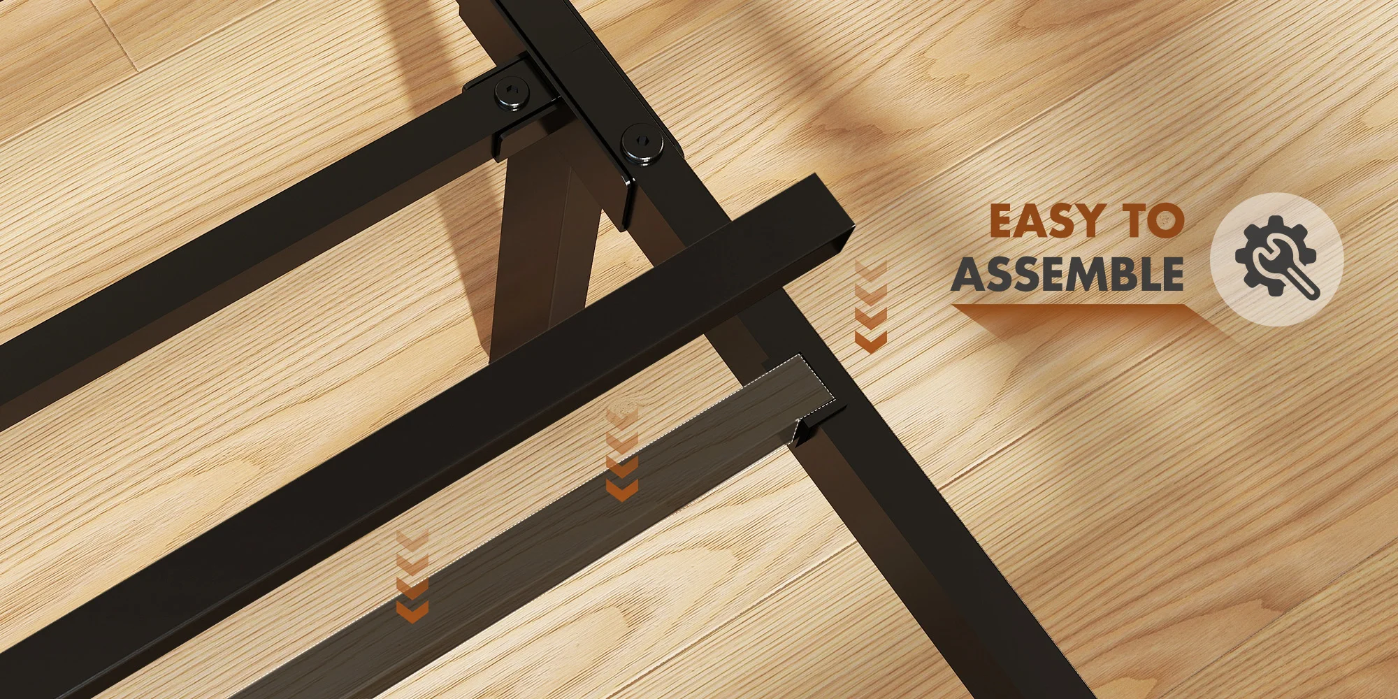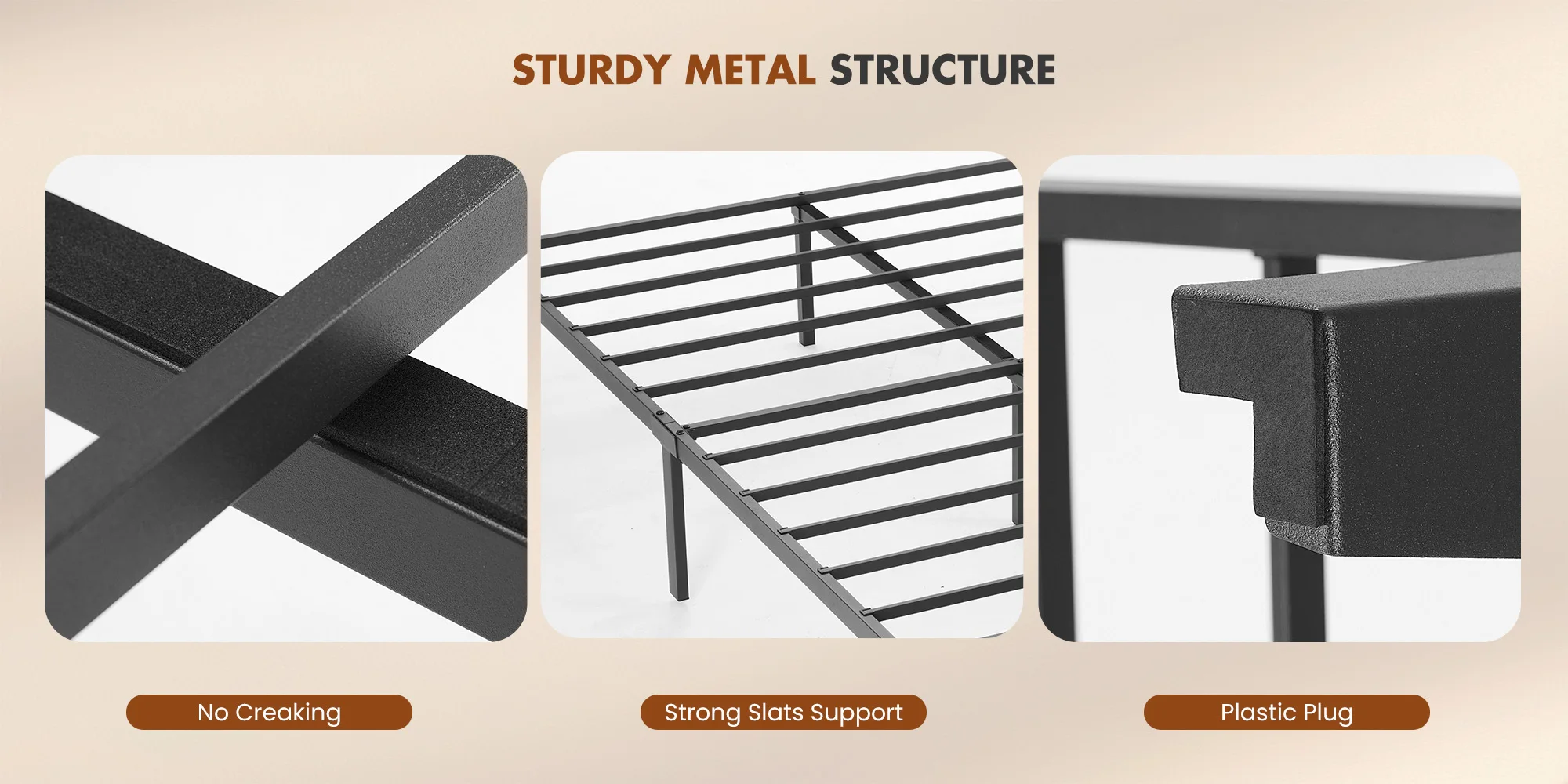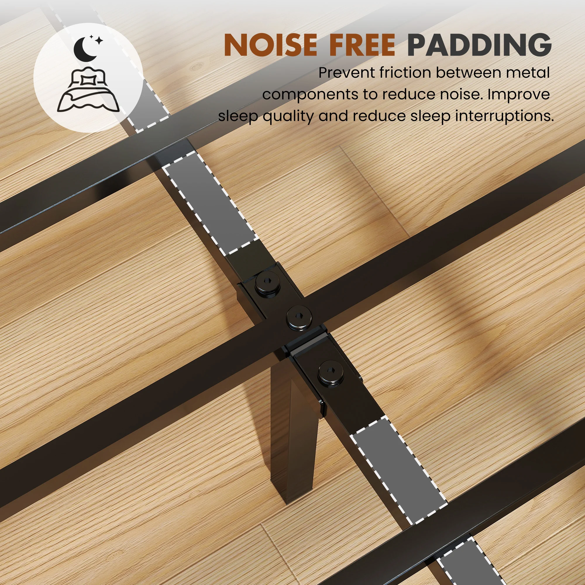 【Whisper-Quiet Nighttime Experience】:Engineered for peaceful sleep,our bed frame with headboard features a noise-reducing foam-padded center rail.Combined with heavy-duty metal slats and reinforced legs,this sturdy construction eliminates squeaks and provides reliable support for any mattress type - no box spring required.