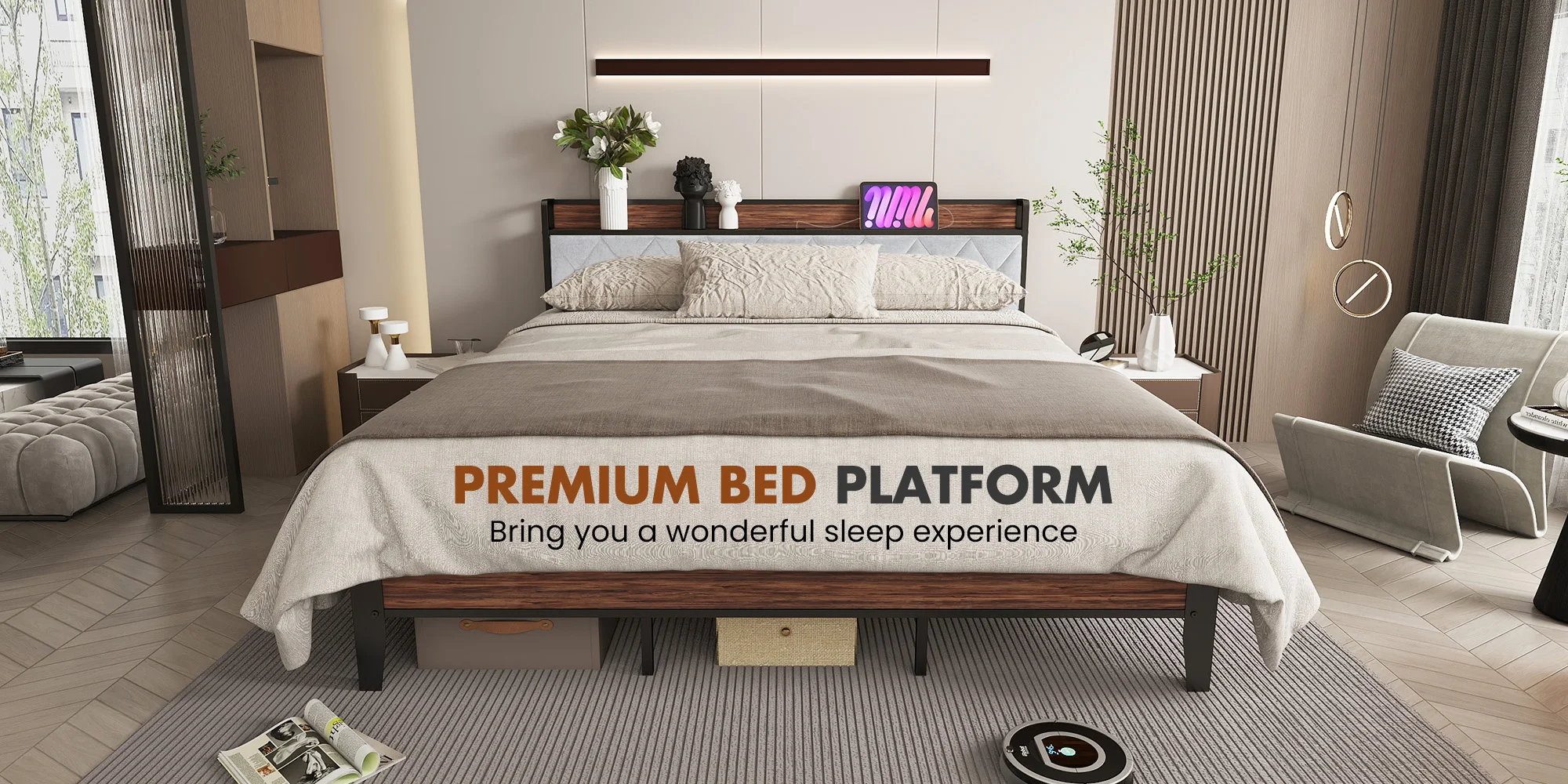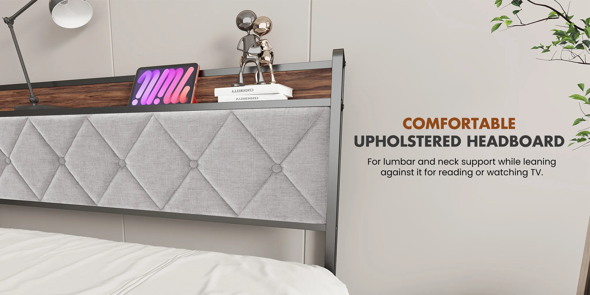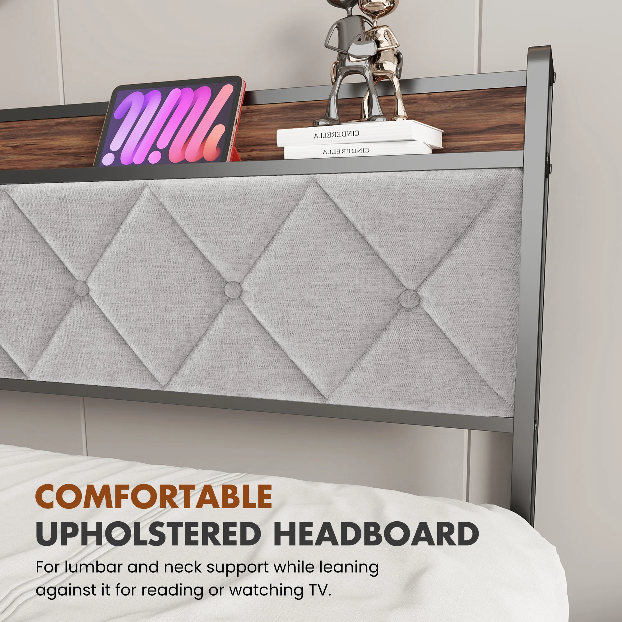 【Modern Style Meets Practical Design】:The upholstered headboard blends contemporary aesthetics with functionality,featuring clean lines and neutral tones to complement any bedroom decor.The angled iron legs add both visual appeal and exceptional stability to this bed frame with storage.