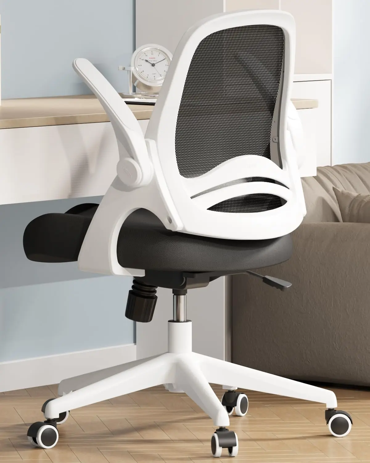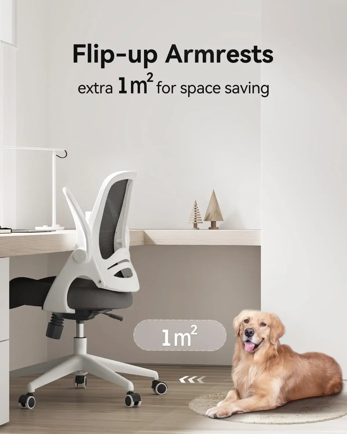 Office Desk Chair with Flip-Up Armrests and Saddle Cushion, Ergonomic Office Chair with S-Shaped Backrest, Swivel, Mesh, White