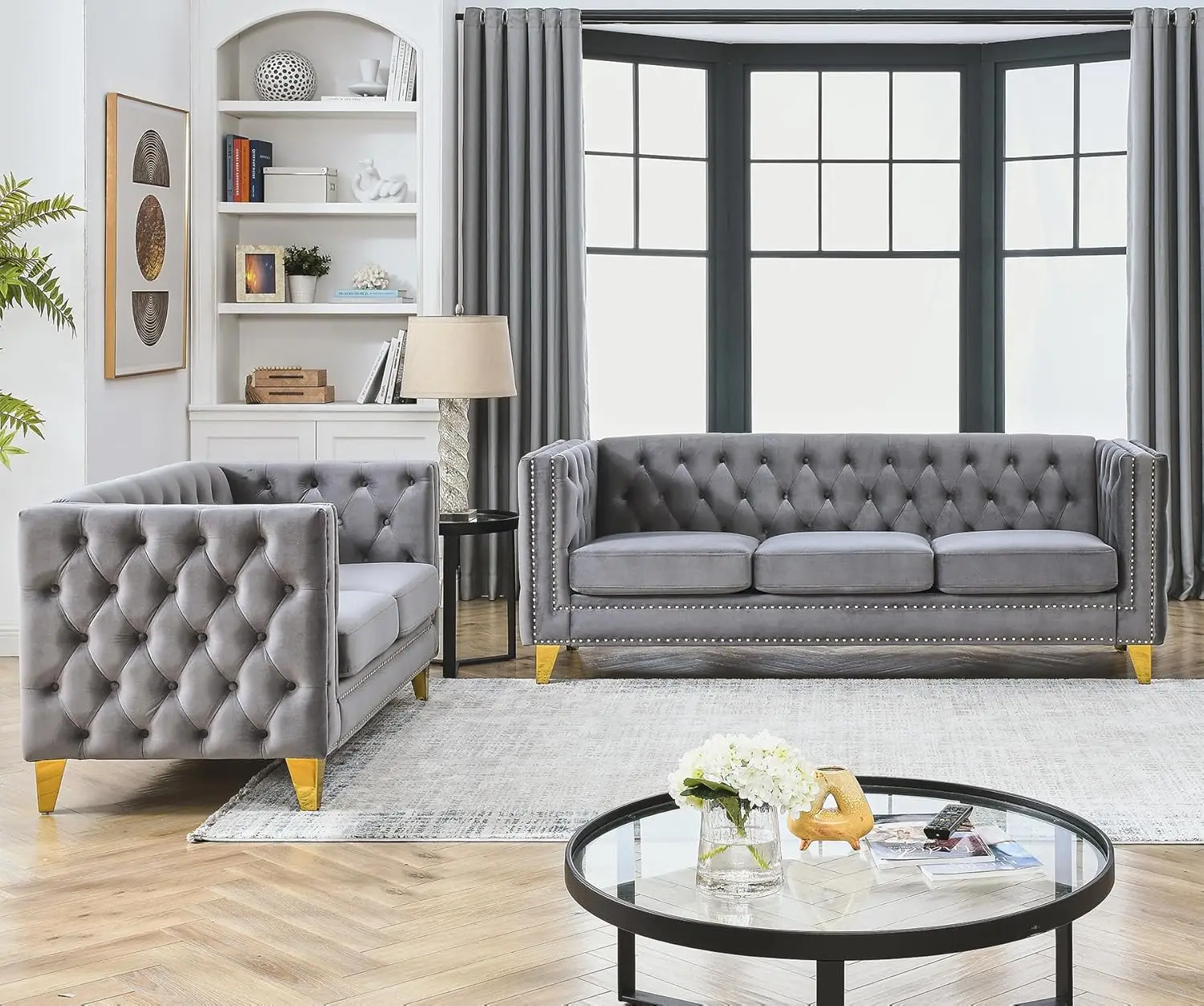 Velvet Living Room Sofa Set of 2, Comfy Loveseat and 3 Seater Couch, Modern Sofa with Tufted Back and Rivet Decoration, Upholstered Long Couch with Solid Golden Metal Tapered Legs, Grey
